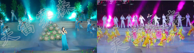 現在大型活動開幕式一般都在室外廣場或室內體育館內舉行,場地大,若沒有較強的舞美表現手段,觀眾不容易集中視線注意到舞臺上在表現什么。那么,運用天雷噴霧系統,能夠在大面積舞臺上集聚性地、快速地出現大面積霧效,使整個氛圍的烘托成為一件易實現和控制的效果。燈光在大場景里也是非常重要的載體。霧與燈光結合,特別是與染色燈的結合作用,把全場的顏色渲染開來,形成豐富的色海,帶給了觀眾極富沖擊力的視覺享受。