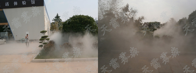 該小區配套的霧森系統是杭州天雷噴泉設備有限公司生產制造安裝的。系統主要組成包括高壓主機組,紅寶石撞針噴頭,高壓管道及其他配件等。高壓主機包括:水處理系統,中央集成控制系統,意大利進口高壓系統,特種隔音系統,7寸液晶觸摸屏,遠程遙控系統,自動保護系統。