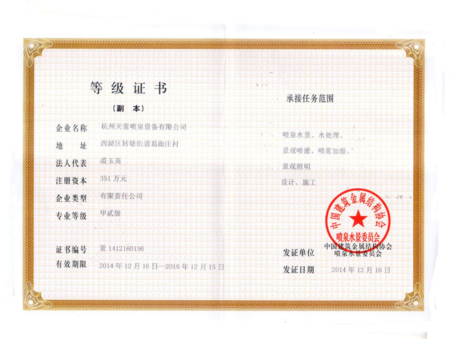 企業新聞:公司榮獲噴泉水景甲級資質