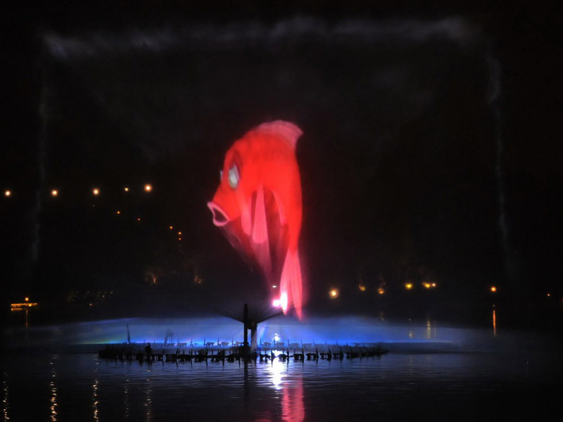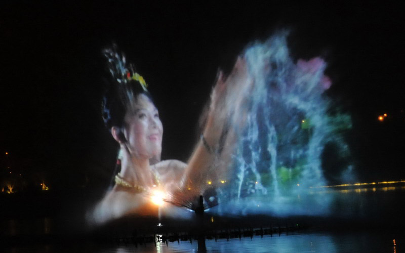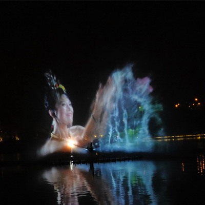 水幕電影是通過高壓水泵和特制水幕發生器,將水自下而上,高速噴出,霧化后形成扇形“銀幕”,由專用放映機將特制的錄影帶投射在“銀幕”上,形成水幕電影。當觀眾在觀摩電影時,扇形水幕與自然夜空融為一體,當人物出入畫面時,好似人物騰起飛向天空或自天而降,產生一種虛無縹緲和夢幻的感覺,令人神往。
