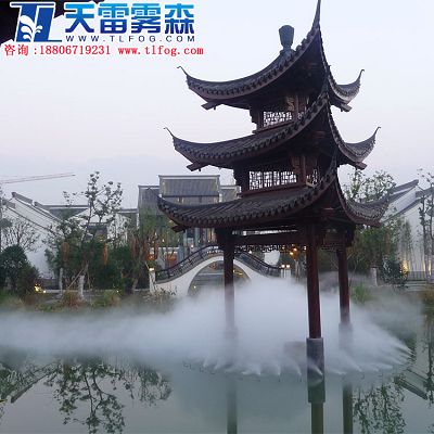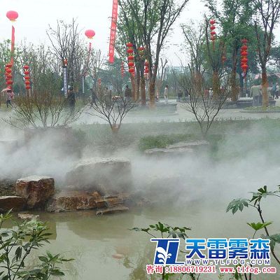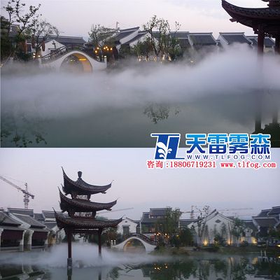 在一些功能齊全、高品質的住宅小區里,流水與人造的平臺是非常普遍的組合,在這里霧起到了環境烘托的良好功能。流水、平臺,霧的靈動與飄逸渲染了一個幽雅的居住氛圍。