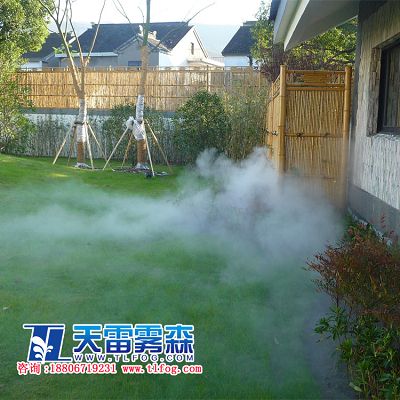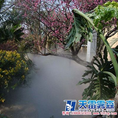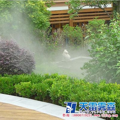 霧縈繞在樹叢之間,大自然的味道在似真似幻中得以再現(xiàn),在這樣一種霧與樹木所營造的空間里,帶來一絲纏綿而又清新的意境。飄渺的霧覆蓋在碧綠的草地上,仿佛再現(xiàn)了山野田園的自然風貌,而霧的升華,更有效的滋潤、保護了綠地的生長,可謂一舉兩功效。